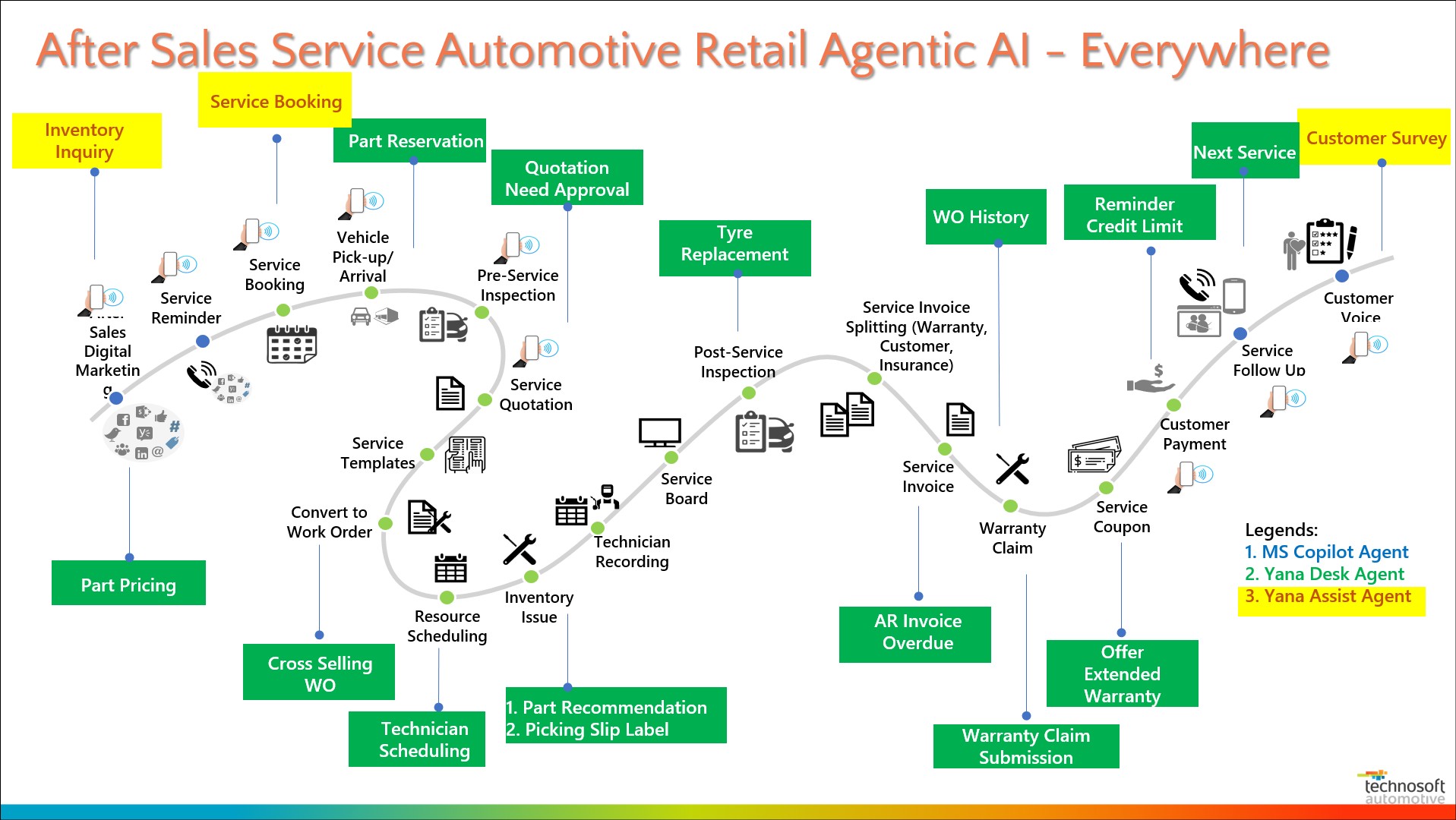 Our roadmap extends beyond the initial sale, encompassing after-sales service, reminders, booking, inspections, quotations, work orders, resource scheduling, inventory management, warranty claims, customer surveys, and digital marketing. Yana’s agents ensure that every customer interaction is seamless, proactive, and value-driven, fostering long-term loyalty and satisfaction.