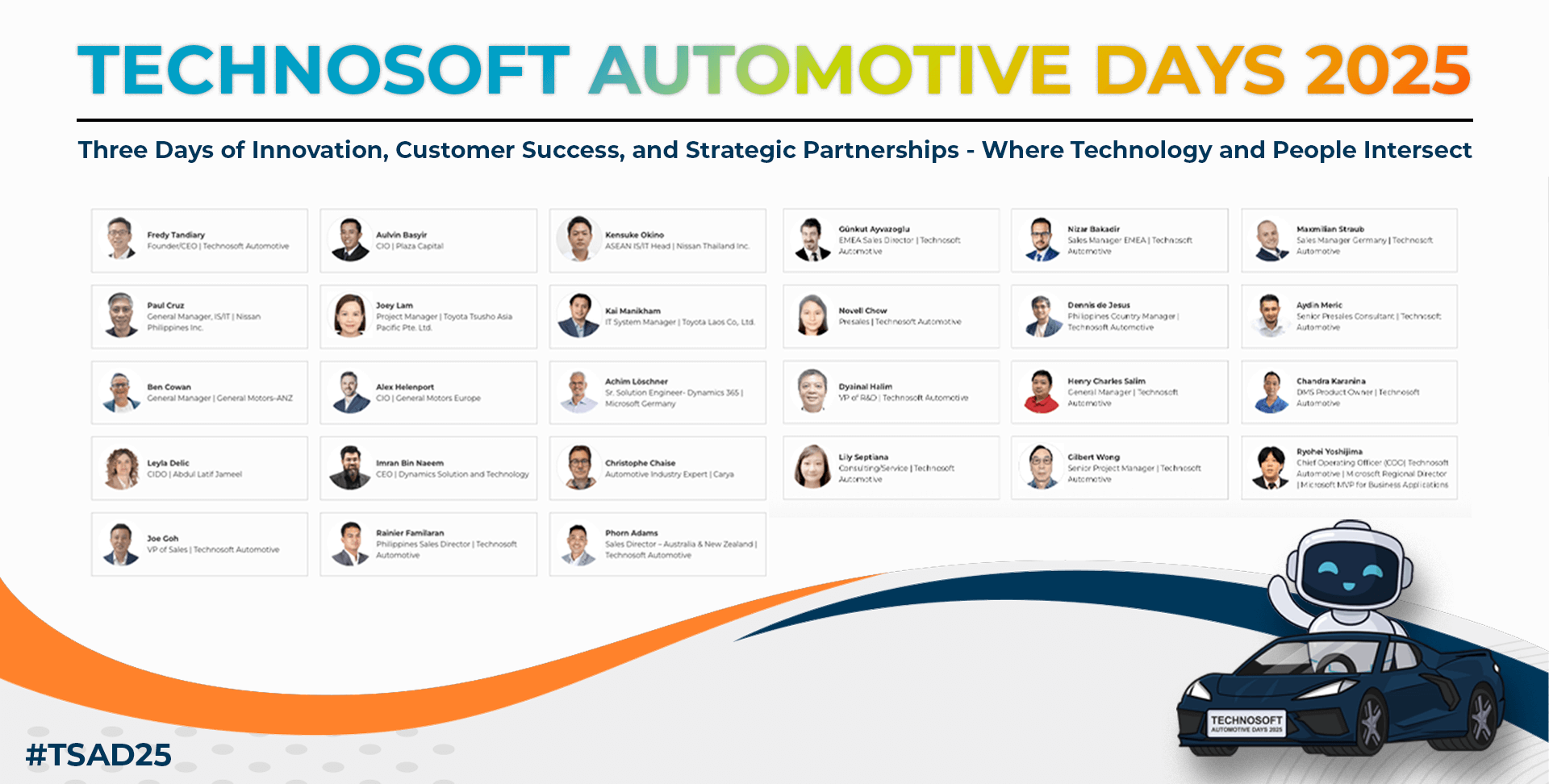 From October 7 to 9, 2025, industry leaders, OEMs, partners, and innovators from across Asia-Pacific, Oceania, and EMEA came together for Technosoft Automotive Days 2025, a global online event hosted by Technosoft Automotive’s Singapore headquarters. Over three dynamic days, we explored how AI, Copilot, and Microsoft-powered technologies are reshaping the automotive industry — not just in theory, but through real-world implementations and voices from the field.