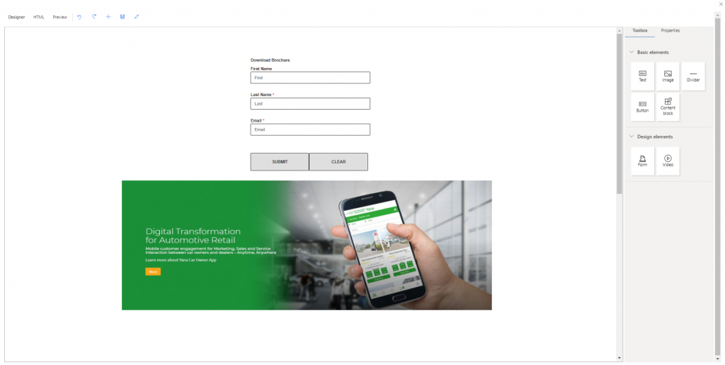 - Drag & Drop designer to add text, images buttons, flexibility to create form field contents