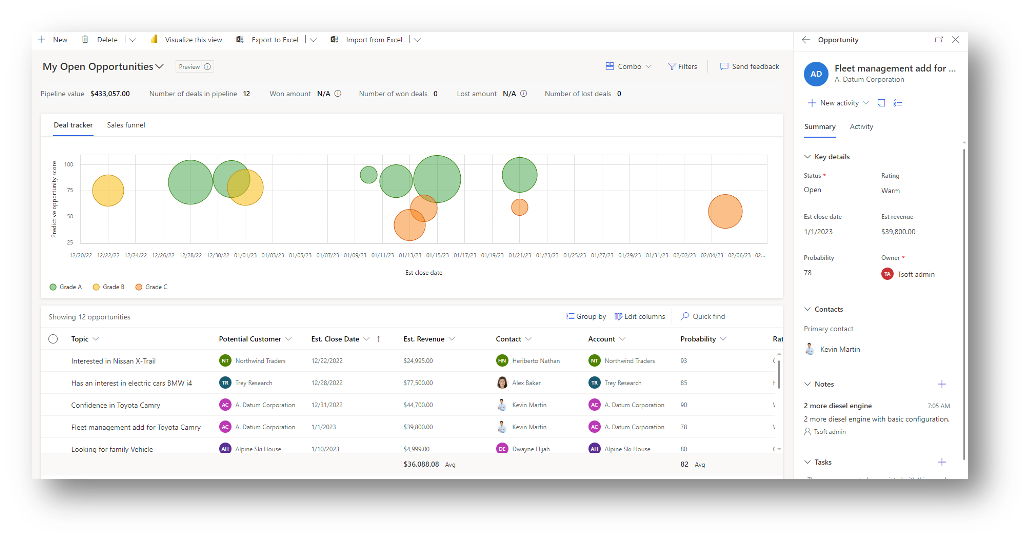 The funnel diagram demonstrates that you have a variety of deals at every stage. Using the Bubble Chart, you can rapidly identify problems with sales that are closing soon. For instance, a fleet management deal scheduled to close on January 1 has an opportunity score of 78. You can rapidly review the notes and check the activities. As an example, today’s job is to review a quotation. You can review swiftly and move on to the next task.