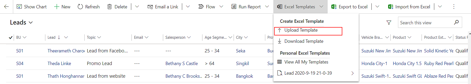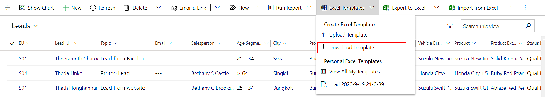 To create a basic template, choose Download Template from the toolbar, select Entity, and View where you require the data.