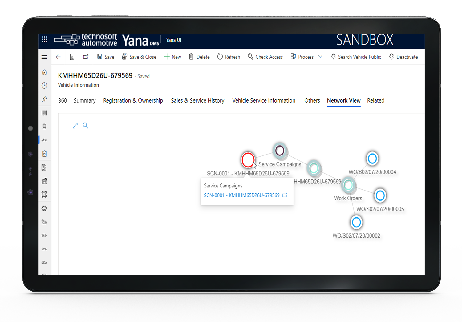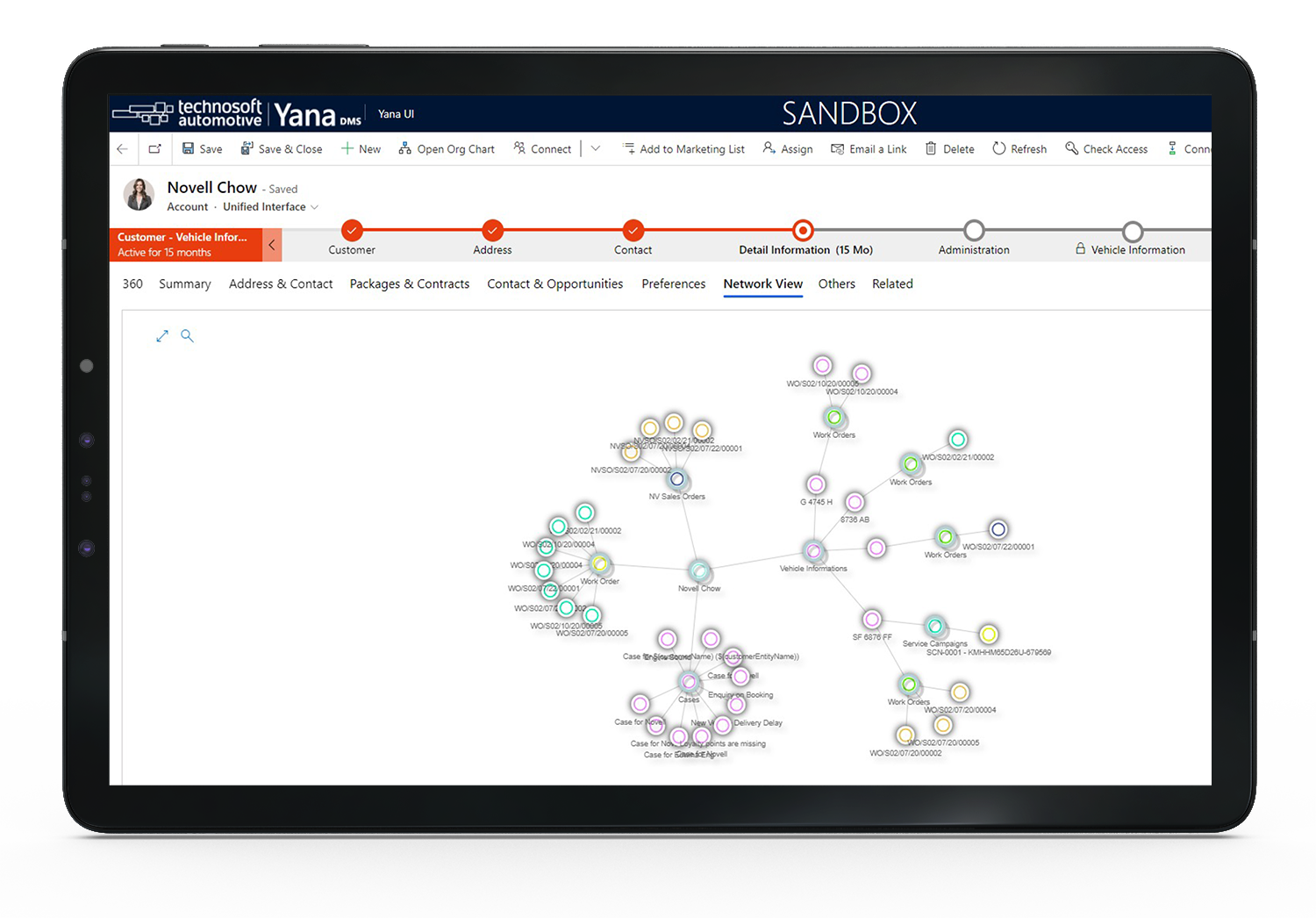 Yana Network View is designed to harness a fundamental change in today’s world. At Technosoft Automotive, we understand that customer data is essential, allowing different types of data storage, such as sales orders, case records, customers’ current vehicles, and related work orders, which can be seen on the same screen. Subsequently, organizations can coordinate and leverage various data collections to increase user efficiency. Moreover, you can reach any records by clicking the details of a point.